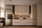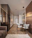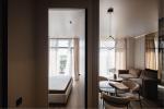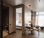 Квартира має одну спальню та кімнату студію з обіднім столом та кухнею.